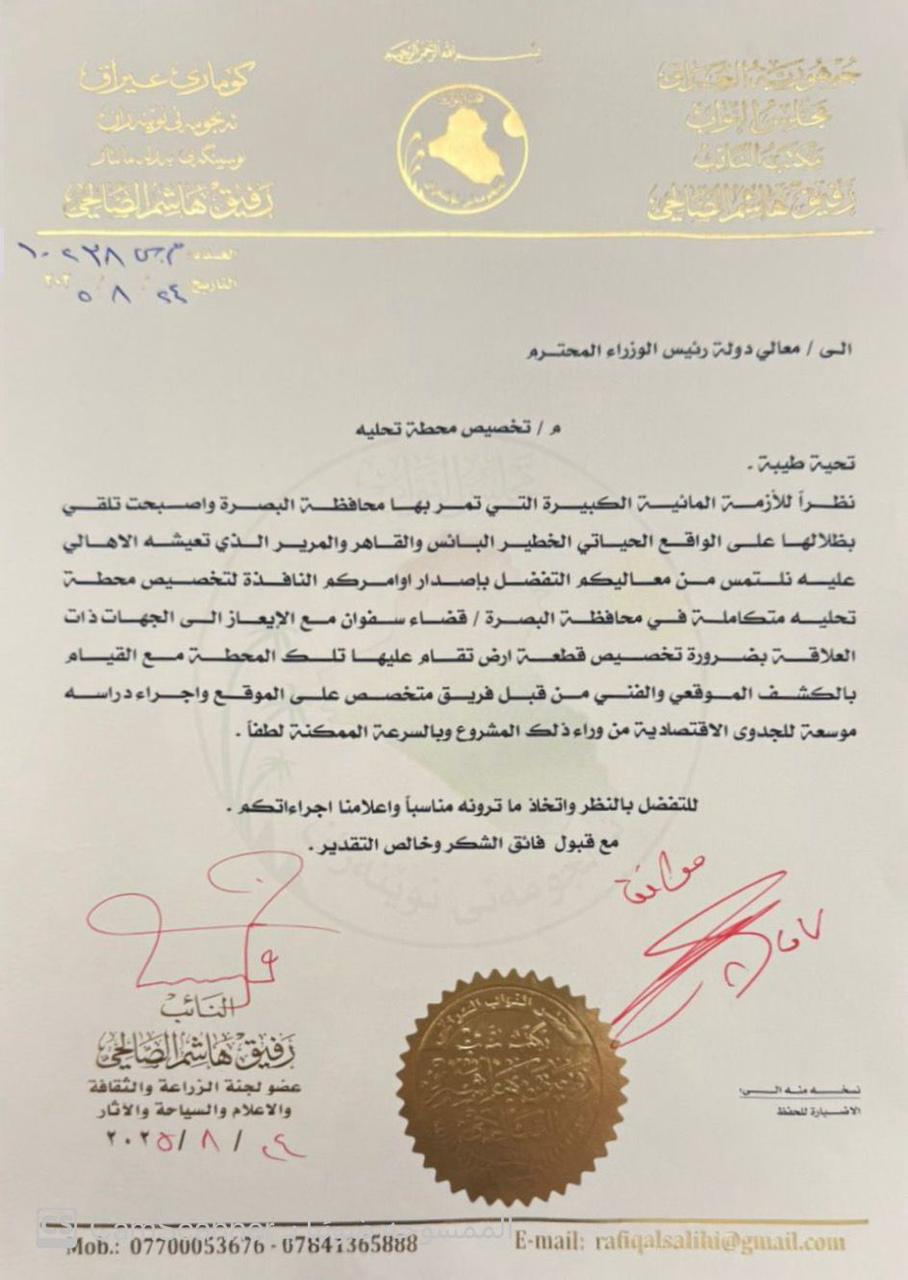النائب رفيف هاشم الصالحي يعلن موافقة رئيس الوزراء على إنشاء محطة لتحلية المياه في سفوان