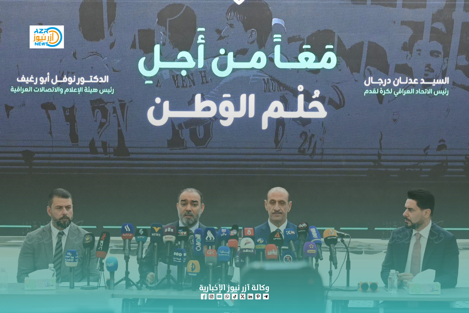 عقد رئيس هيأة الإعلام والاتصالات د.نوفل ابورغيف مع رئيس الاتحاد العراقي لكرة القدم الكابتن عدنان درجال، مؤتمراً صحفياً مشتركاً في مقر الاتحاد، أعلنا فيه العمل برؤية مشتركة لدعم المنتخب الوطني في مشوار الملحق الآسيوي المؤهل إلى نهائيات كأس العالم 2026، بحضور ممثلي وسائل الإعلام الوطنية والدولية.